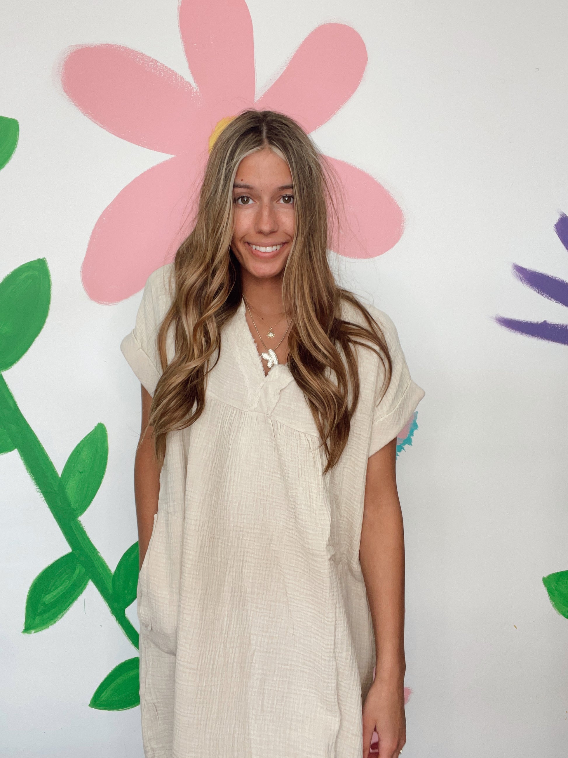 Let the raw and edgy nature of this washed double gauze dress take your style to the next level. Featuring a flattering v-neck and convenient pocket, this dress comes in 4 classic colors. All for this unique and versatile piece - it's a must-have!