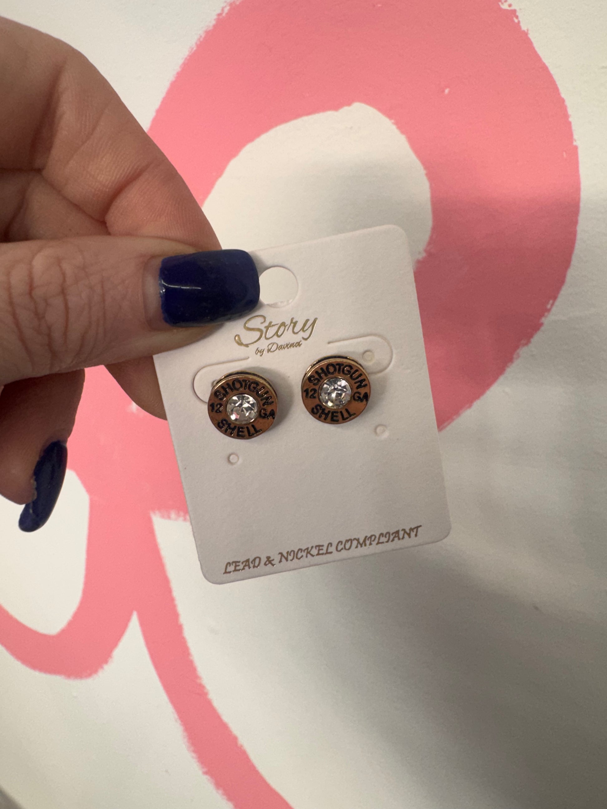 Sparkle like a sharpshooter with these bold 12 GA bullet shell studs, complete with a dazzling rhinestone centerpiece. Perfect for anyone who loves Western flair with a glitzy twist. Lead and nickel compliant for worry-free wear.