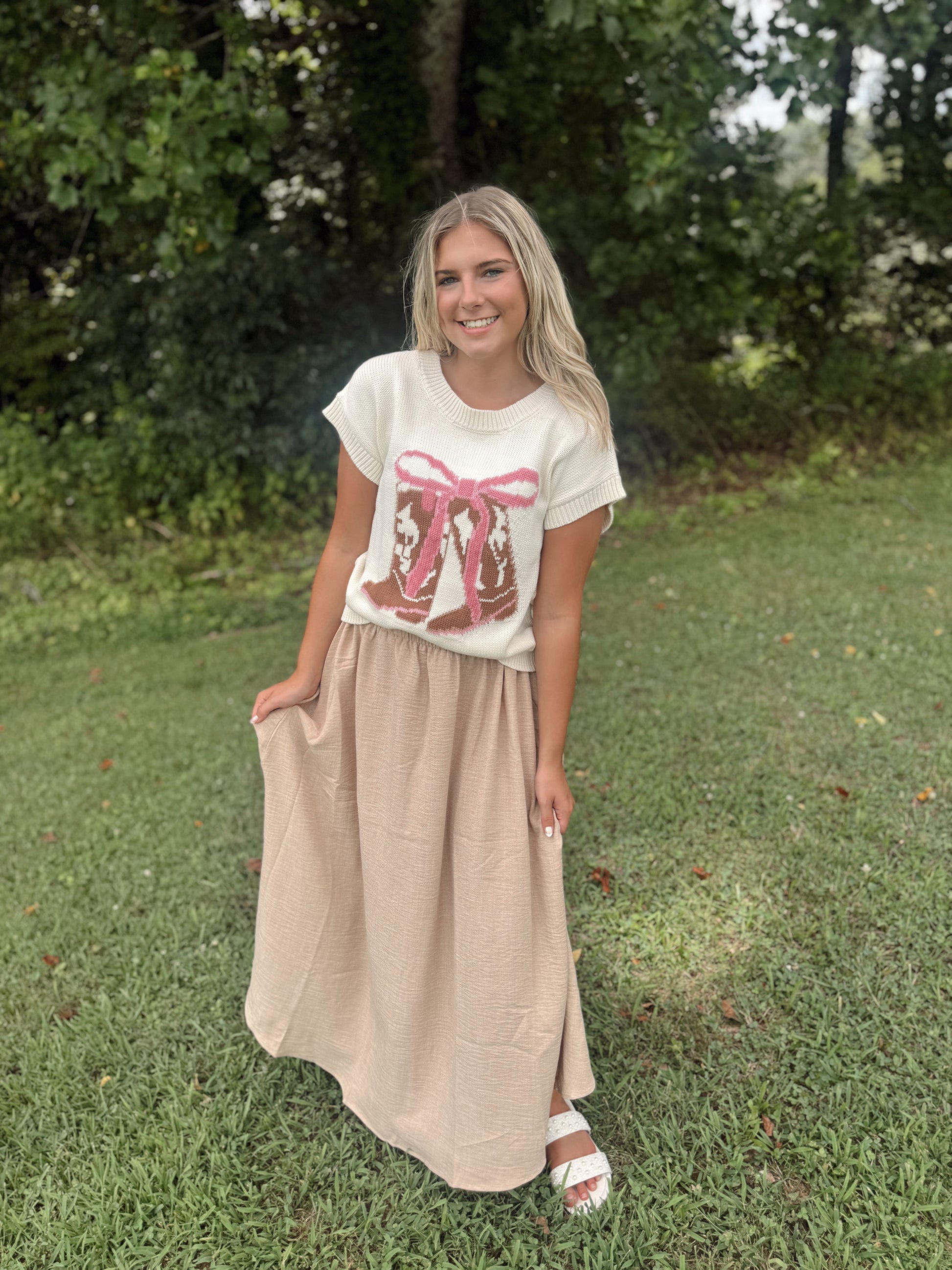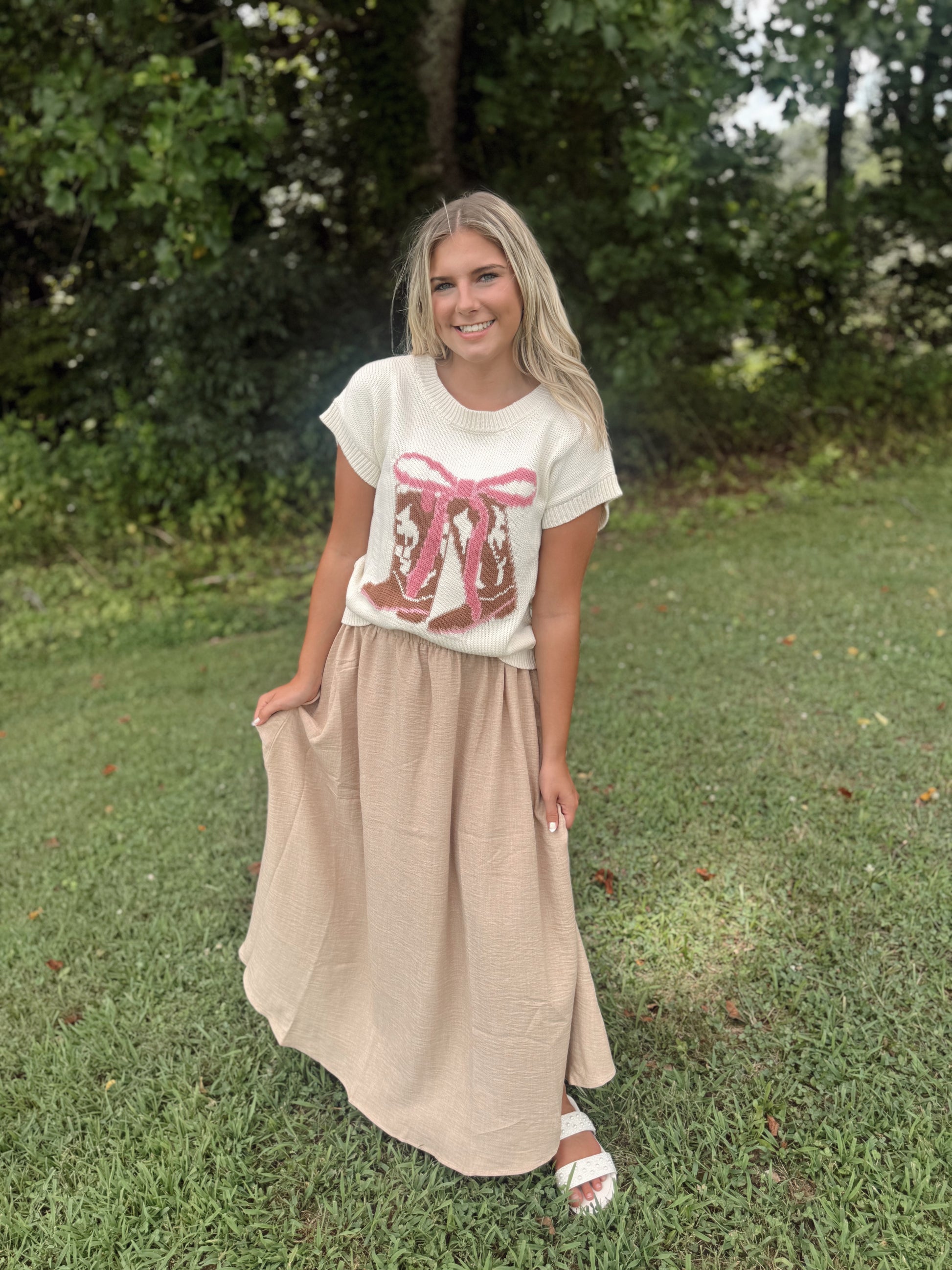 Elevate your wardrobe with the Chasing Love Boots Sweater Top, featuring a refined boot bow jacquard pattern on a short sleeve knit design. Crafted for both style and comfort, this sweater offers a sophisticated texture that pairs effortlessly with casual or dressier looks. Its breathable knit fabric ensures all-day wearability, making it a versatile addition to your seasonal collection.