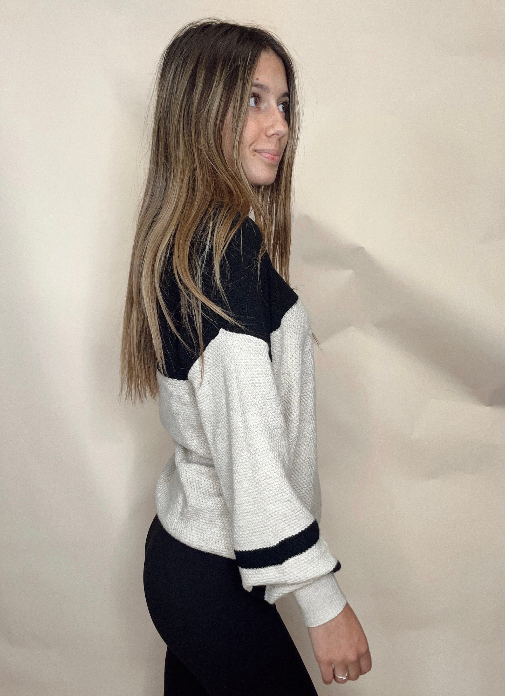 The Cottonwood Top combines understated elegance with practical comfort. This casual sweater features a sophisticated parchment base accented by color-blocked knit stripes along the sleeves, creating visual interest without overwhelming the design. The relaxed fit makes it ideal for layering or wearing solo, while the quality knit construction ensures durability through repeated wear. Perfect for transitional seasons, this piece pairs effortlessly with denim, trousers, or skirts for a polished everyday look.