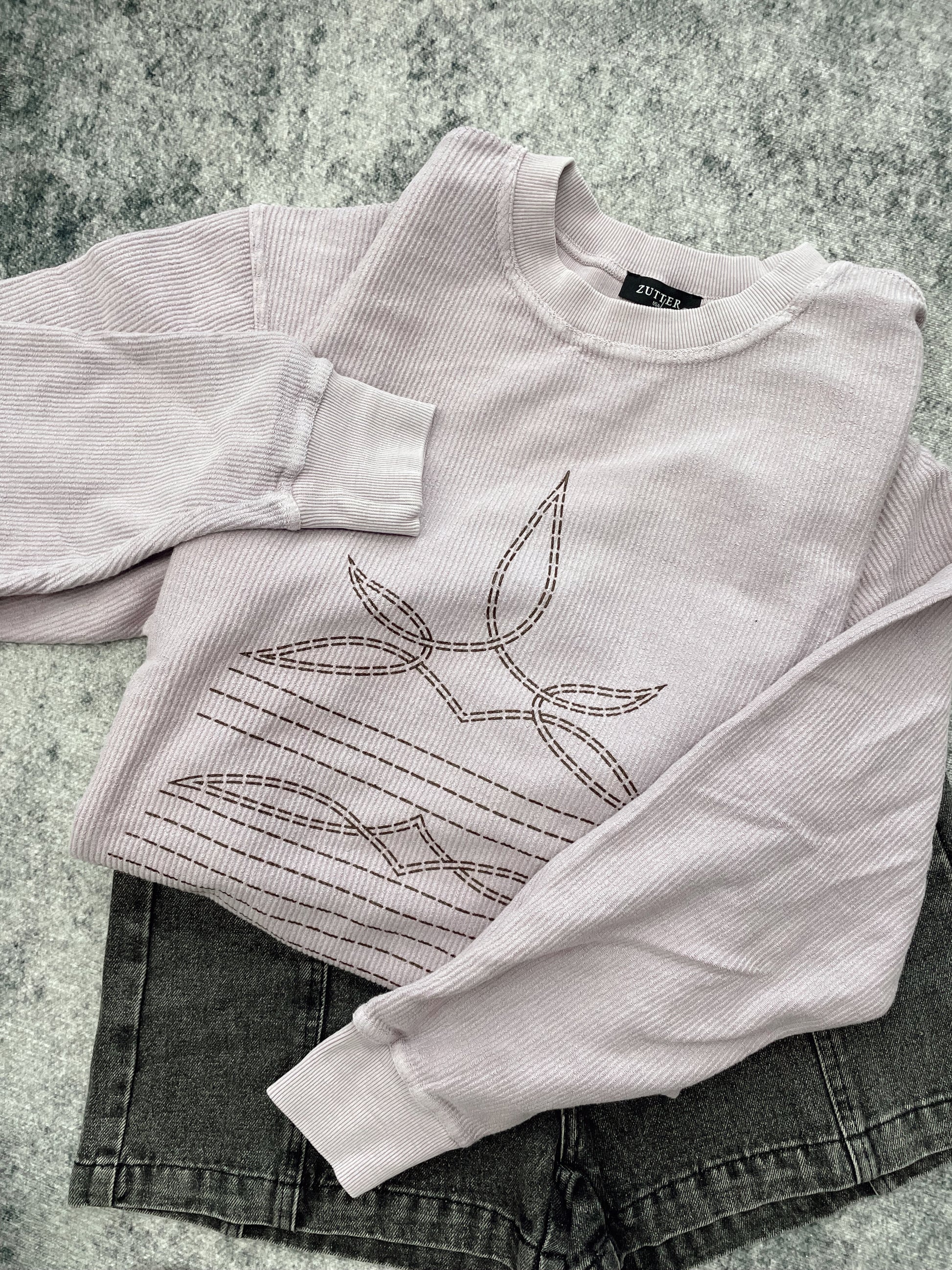 This purple corded sweatshirt features a unique cowboy stitch design, perfect for adding a touch of Western flair to any outfit. The long sleeves provide warmth, making it ideal for cooler days. The corded fabric adds texture and dimension to the graphic, making it a standout piece.