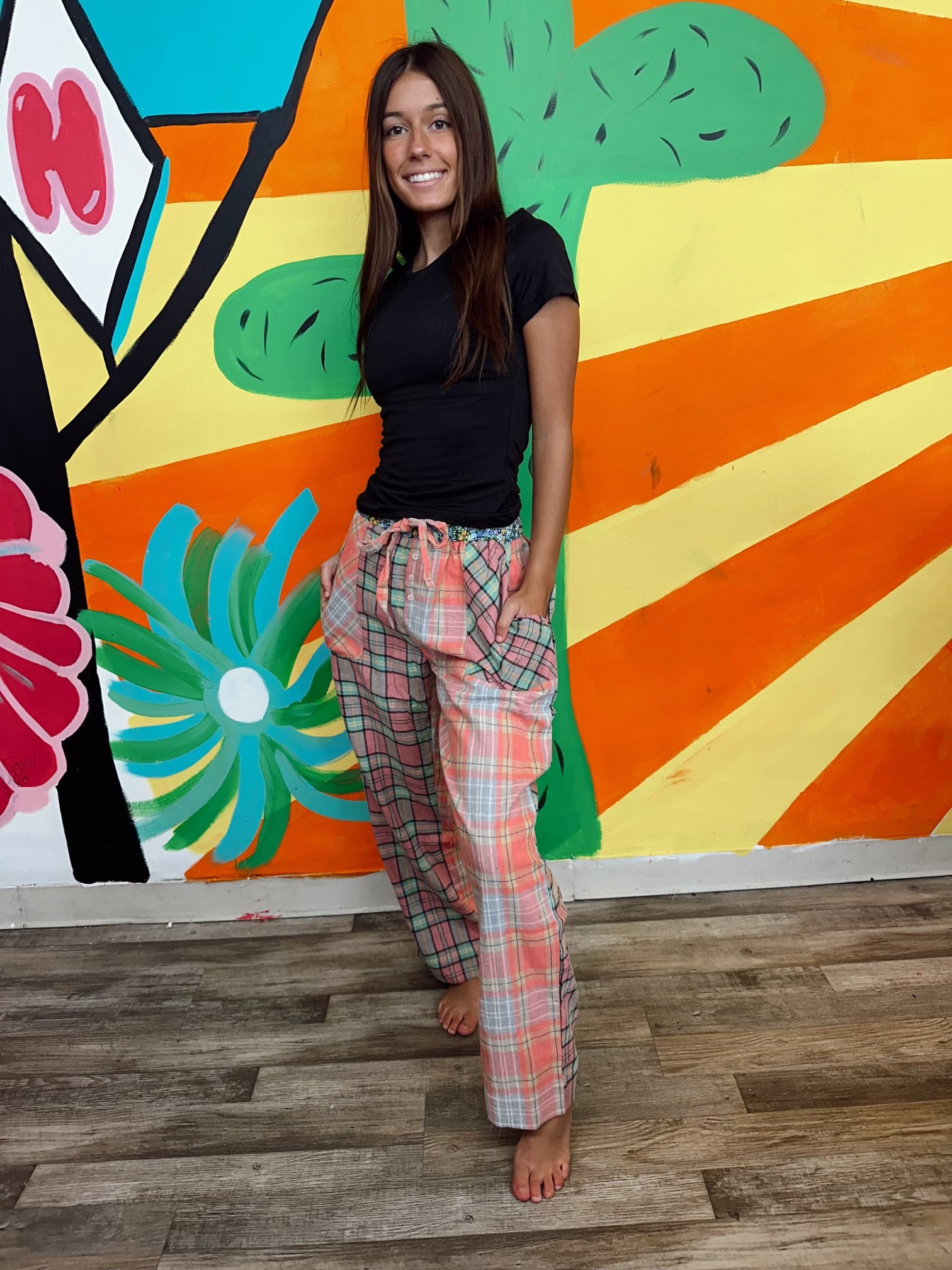 Unleash your inner fashionista with our Dress To Impress Plaid lounge pants! Made with a mix of plaid patterns and a contrasting floral print waistband, these pants are sure to make a statement. The elastic waistband and adjustable drawstring provide comfort and convenience, while the straight legs and side pockets add functionality. Stay stylish and comfy all day long!