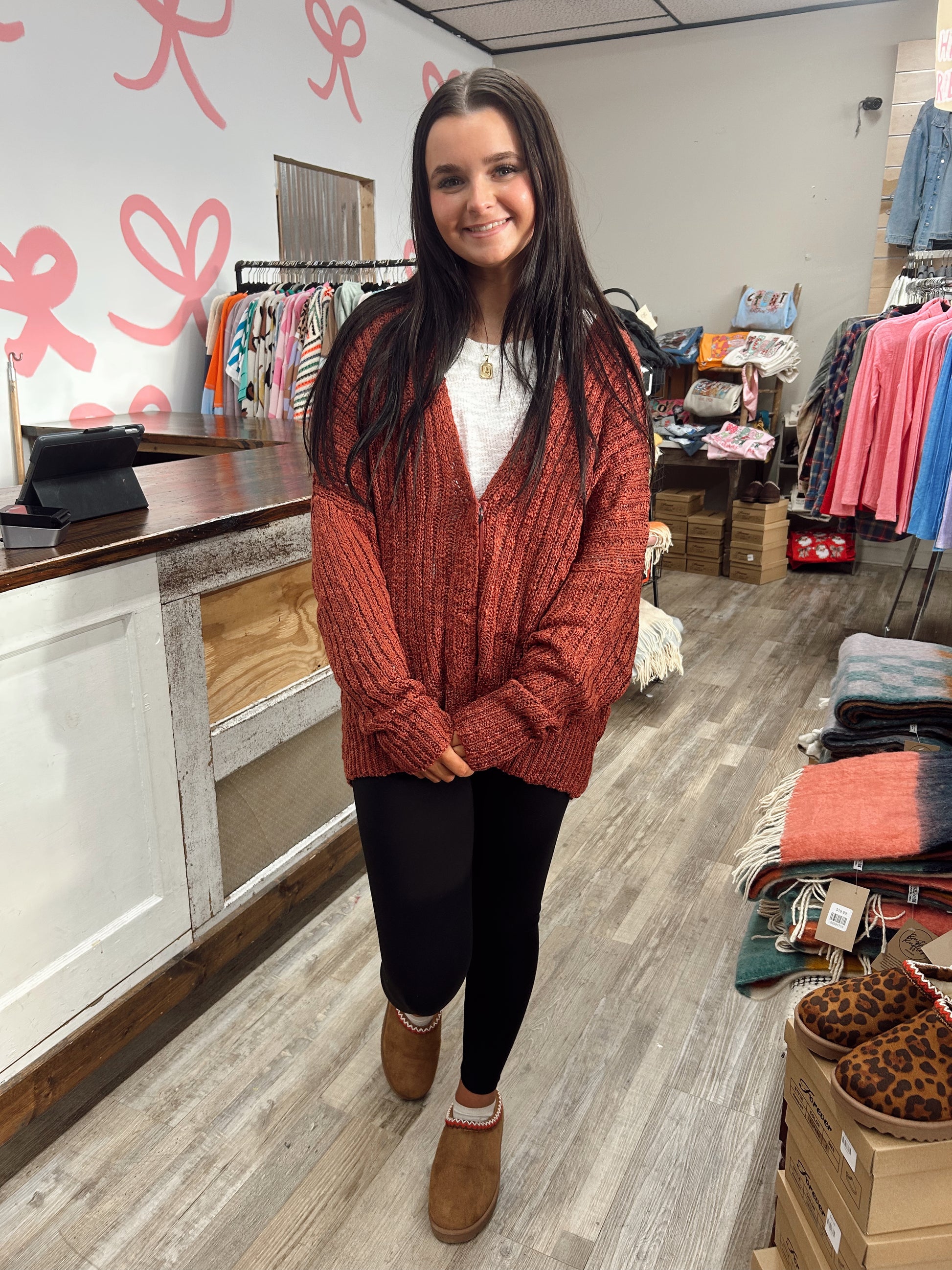 Elevate your layering game with this sophisticated cardigan, featuring a refined rib texture that adds visual depth and tactile interest. The invisible snap button closure delivers a streamlined silhouette while maintaining effortless functionality—perfect for transitional dressing. Crafted with expert attention to detail, this piece transitions seamlessly from casual weekends to polished professional settings. The rust-inspired palette complements a wide range of wardrobes, making it an indispensable staple for versatile styling.