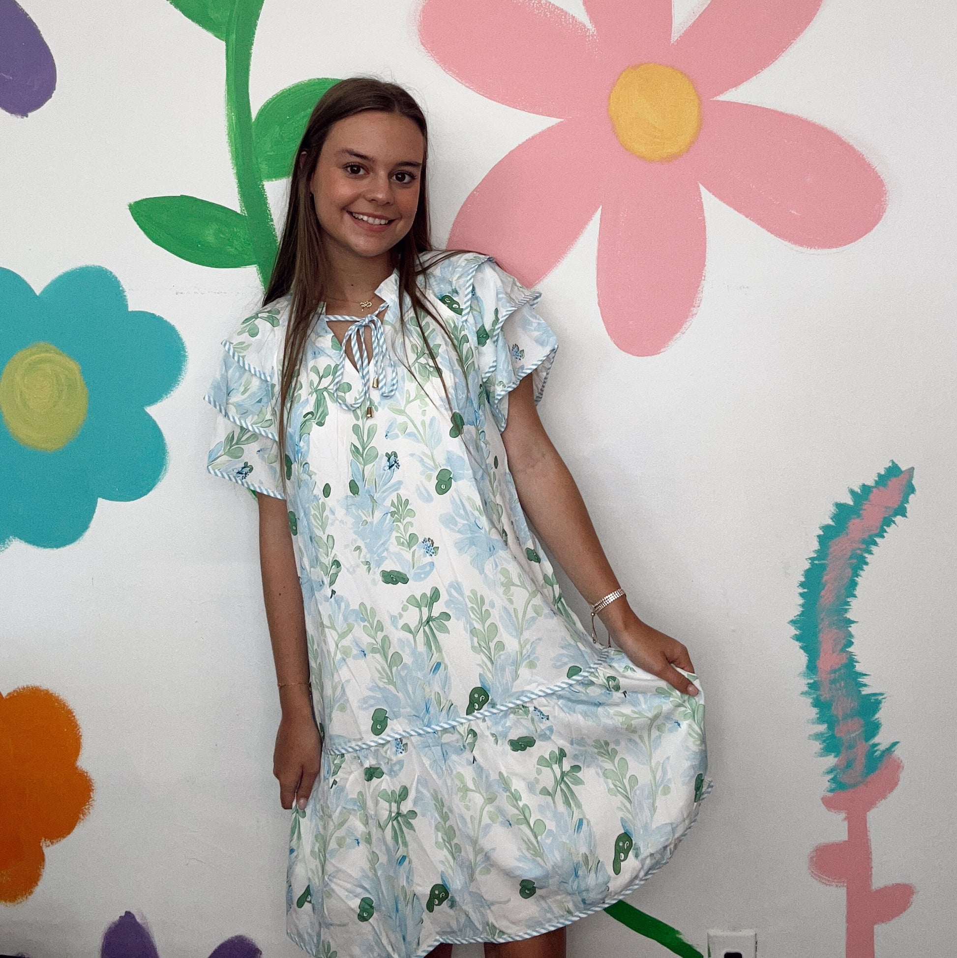 Step into a sunny meadow with the Field Of Wildflowers dress. This playful blue floral dress brings a fresh burst of nature’s charm to your wardrobe, perfect for twirling through warm days and breezy evenings. Its lively pattern and comfortable fit make it your go-to for effortless style and joyful moments.