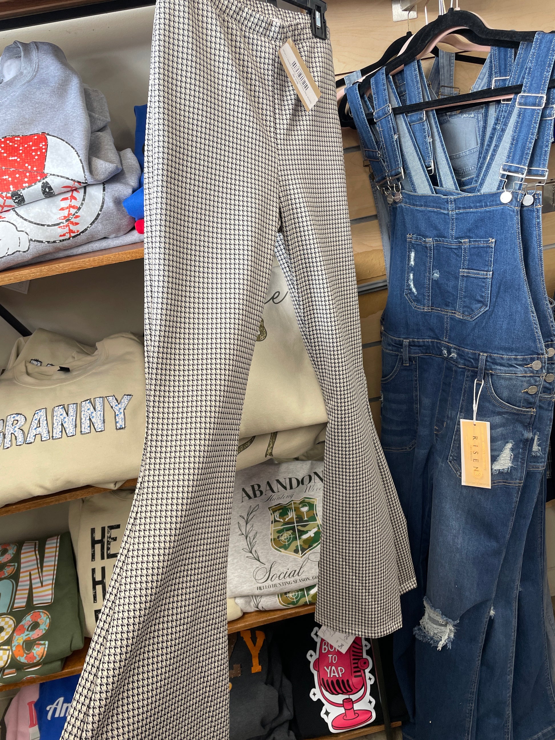 Upgrade your game day outfit with these houndstooth flare pants. Show off your playful side with this quirky twist on a classic pattern. You'll stay comfortable and stylish all day (tailgating to overtime) in these unique statement pants.