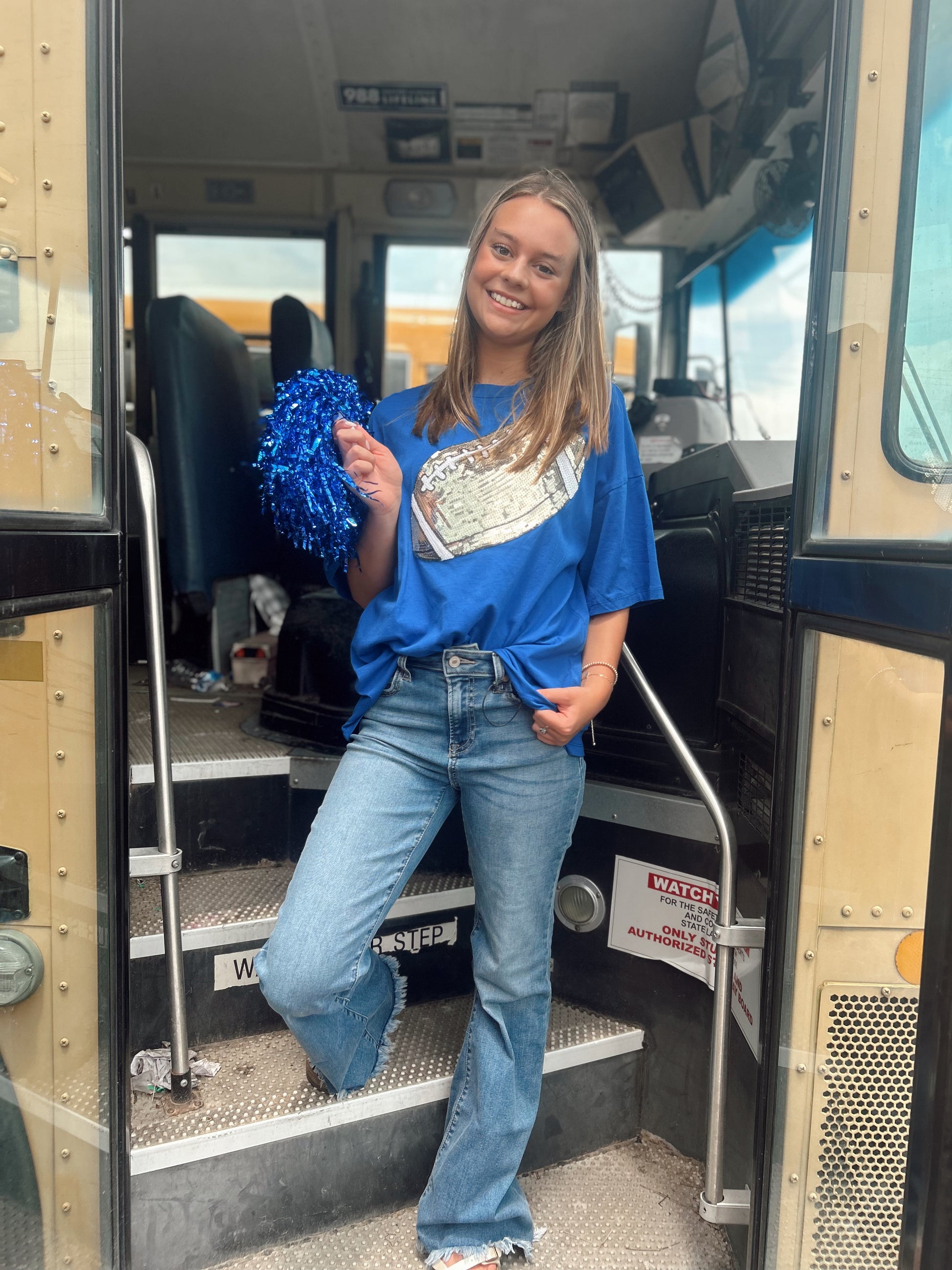Elevate your game day style with the Go Big Blue Sequins Football Top. Featuring a comfortable round neck and short sleeves, this top is adorned with oversized sequins shaped like a football, creating a bold, eye-catching look. Perfect for showing team spirit with a touch of sparkle, it combines casual comfort with standout design for fans who want to make a statement.