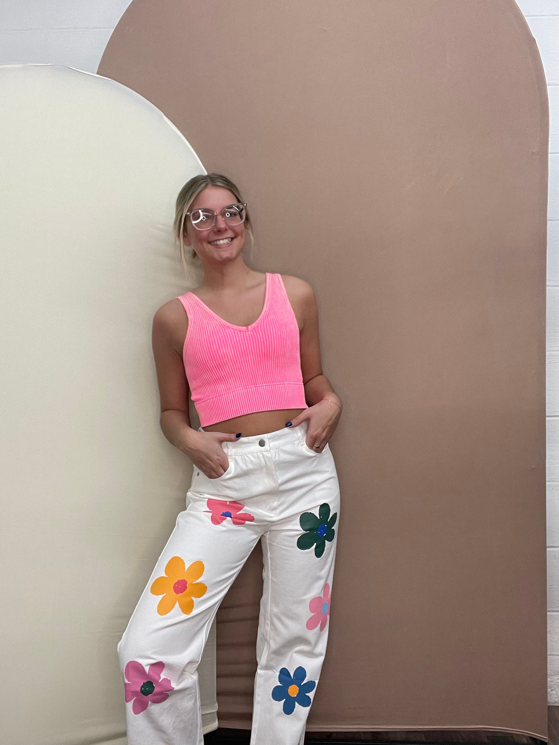Revamp your wardrobe with these Happy Days Daisy Straight Leg Jeans. Featuring a white colorful daisy print, these straight leg pants are perfect for adding a playful touch to any outfit. With a flattering fit and unique design, these jeans are sure to bring a smile to your face.