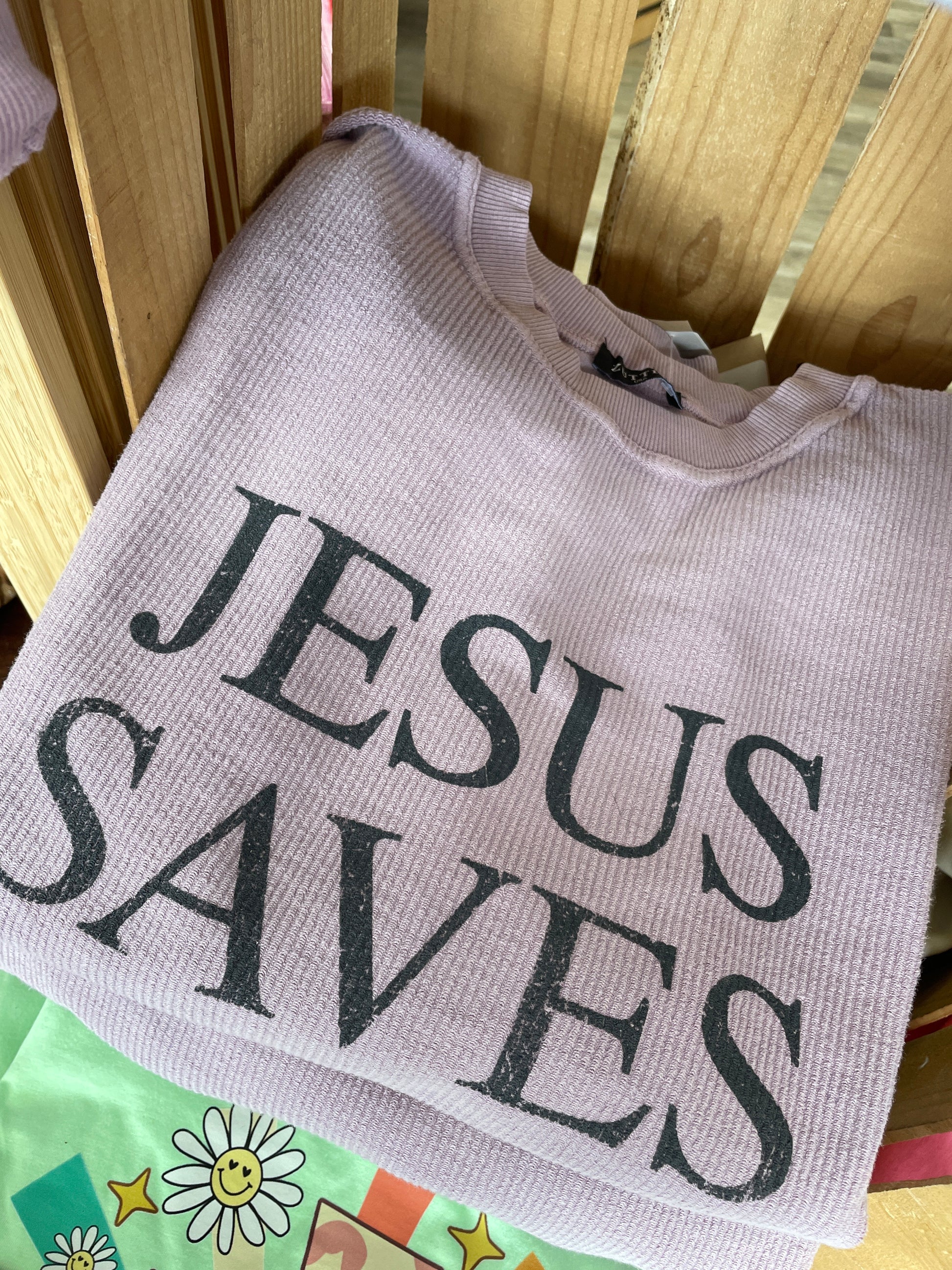 This purple corded sweatshirt, featuring the phrase "Jesus Saves" in bold lettering, is a stylish and comfortable way to showcase your faith. Made with quality materials, this sweatshirt will keep you warm and cozy while spreading a powerful message. Show the world your devotion with this graphic sweatshirt.