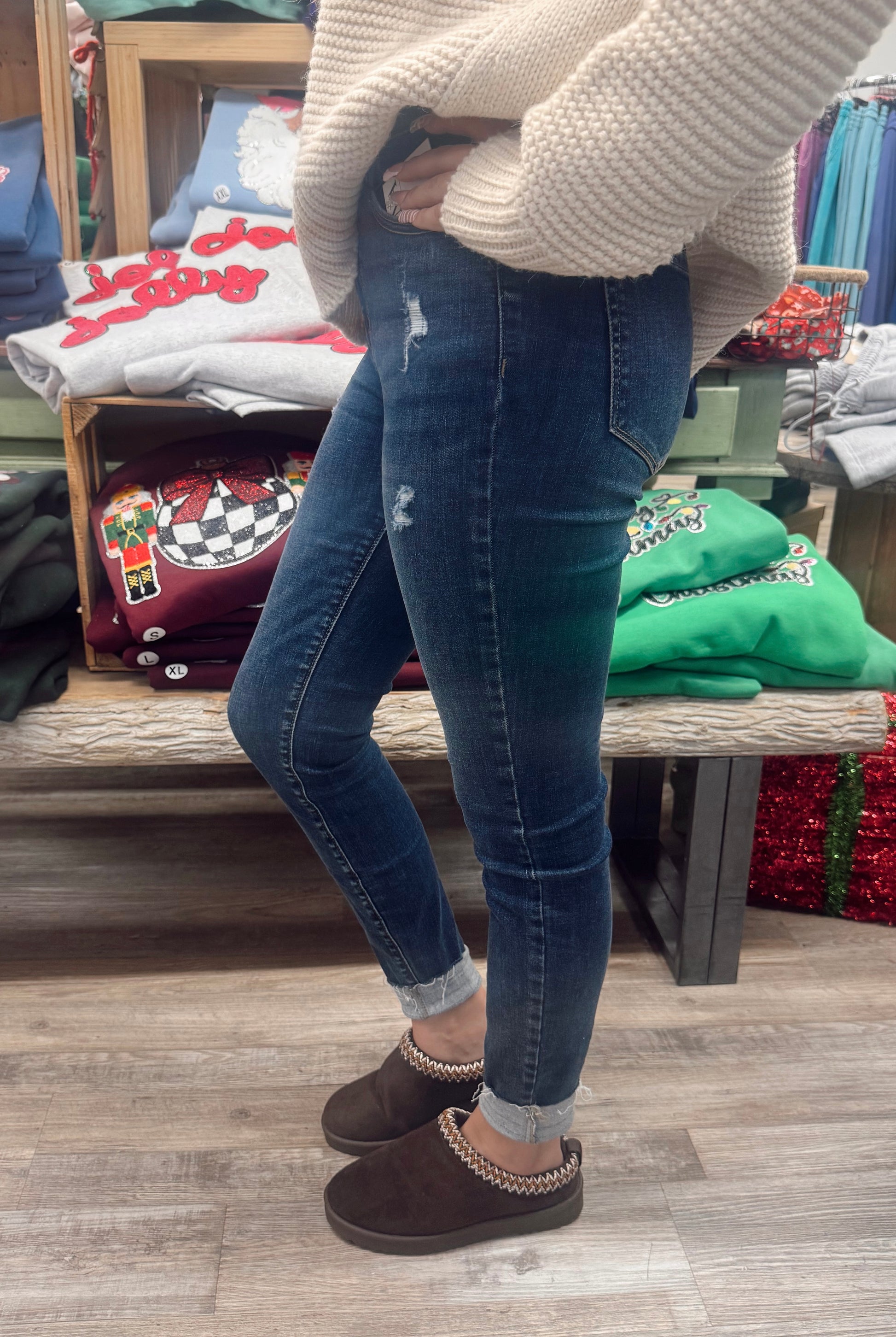 HIGH RISE DISTRTESSED HEM CROPPED SKINNY DENIM PANTS