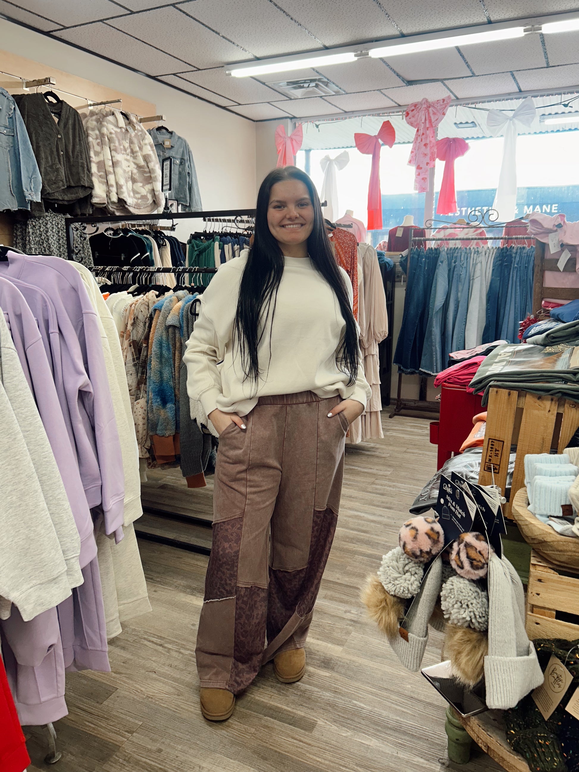 Mixed Emotions Leopard Patchwork Sweatpants blend wild style with cozy comfort. Featuring a bold leopard print mixed with earthy brown tones and patchwork detailing, these mineral-washed sweatpants deliver an effortlessly cool vibe. The relaxed fit keeps you comfy all day, while the unique color-blocking adds personality to your casual wardrobe. Perfect for lounging, running errands, or making a fashion statement without trying too hard.
