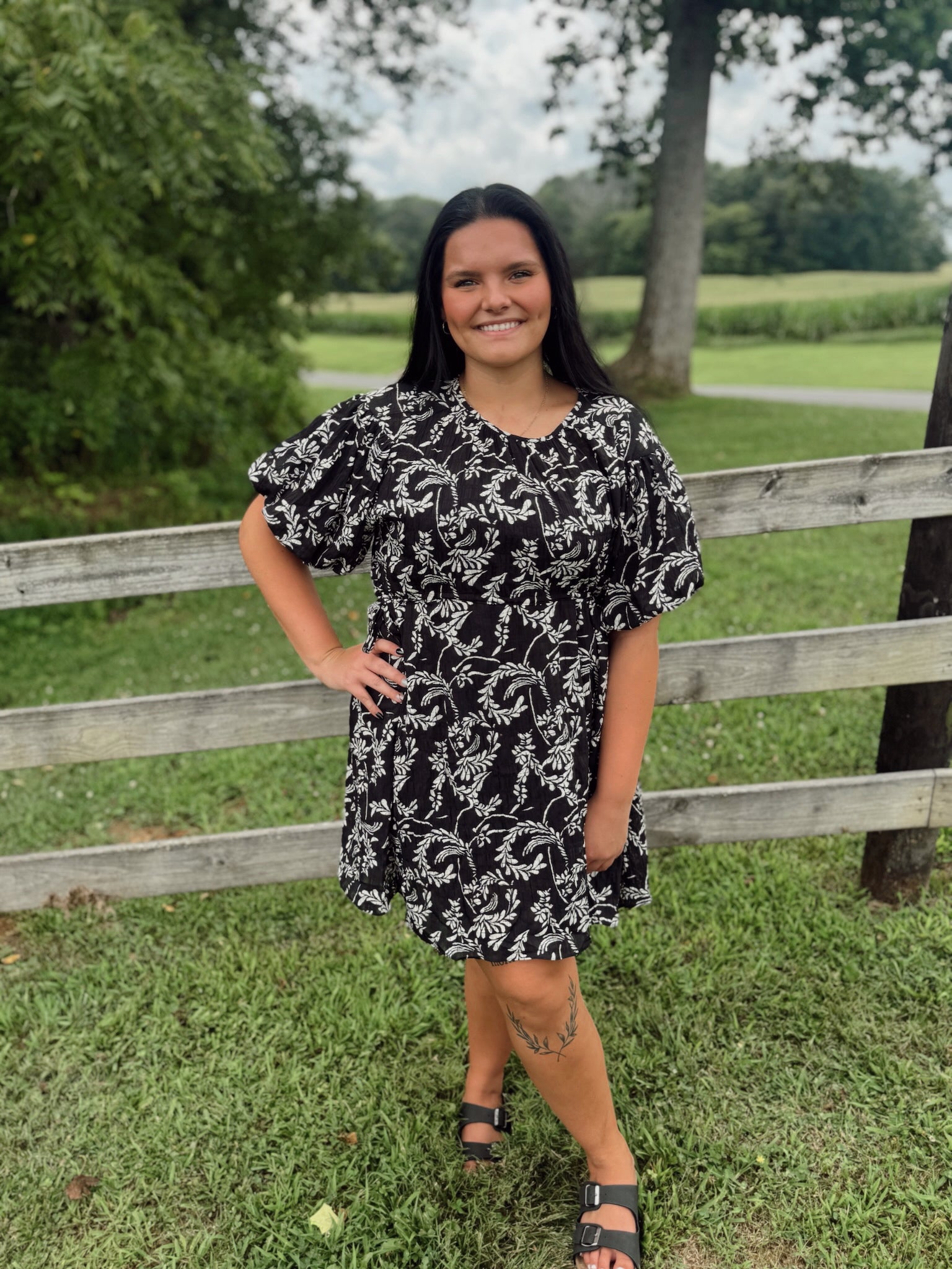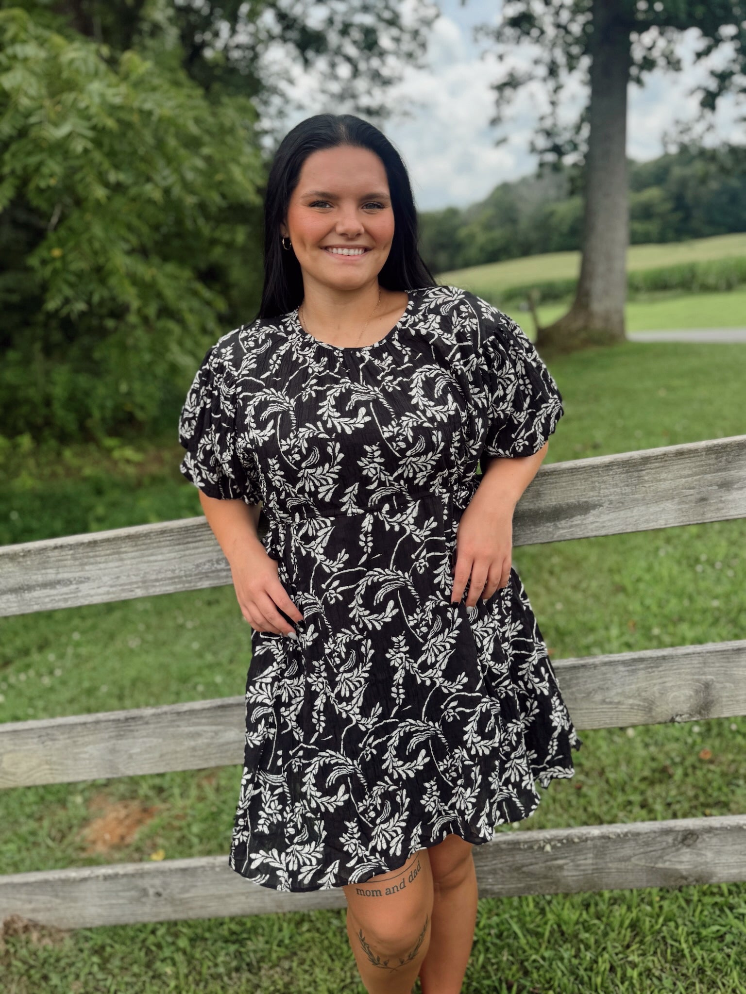 This knee-length floral dress features textured puff sleeves that add a sophisticated volume to the silhouette. Side waist ties allow for a customizable fit, enhancing the waistline while maintaining comfort. Perfect for occasions that call for a blend of elegance and effortless style.