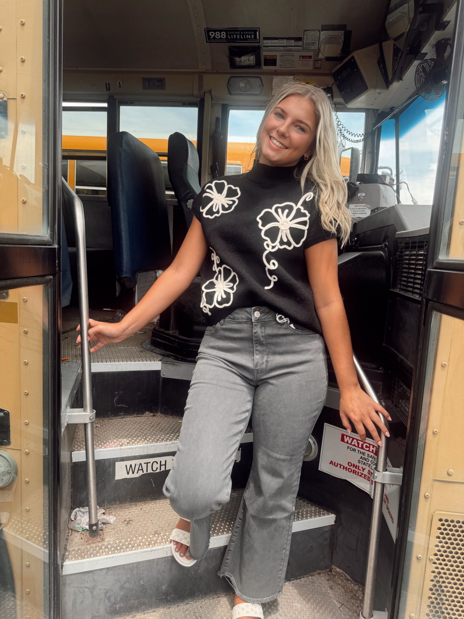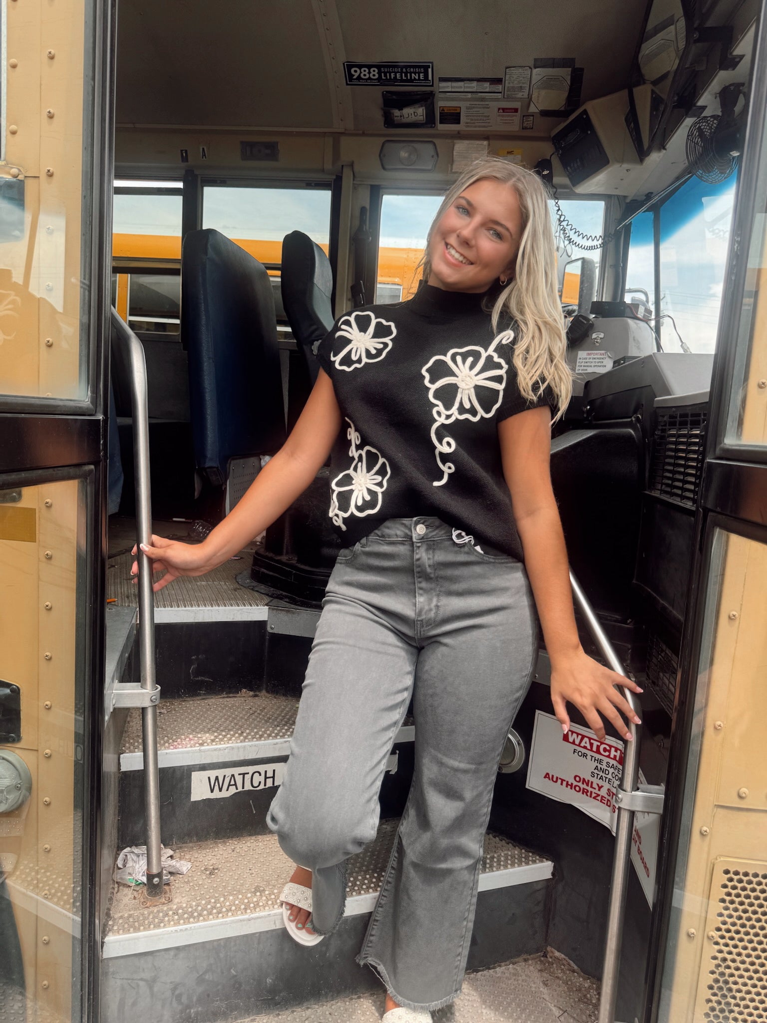 Elevate your wardrobe with the Off The Record Sweater Top, featuring a refined mock neck and delicate contrast floral trim. Crafted with short sleeves for versatile layering, this knit sweater combines comfort and style, making it an ideal choice for transitional seasons. Its subtle floral detailing adds a sophisticated touch, perfect for both casual and polished looks.