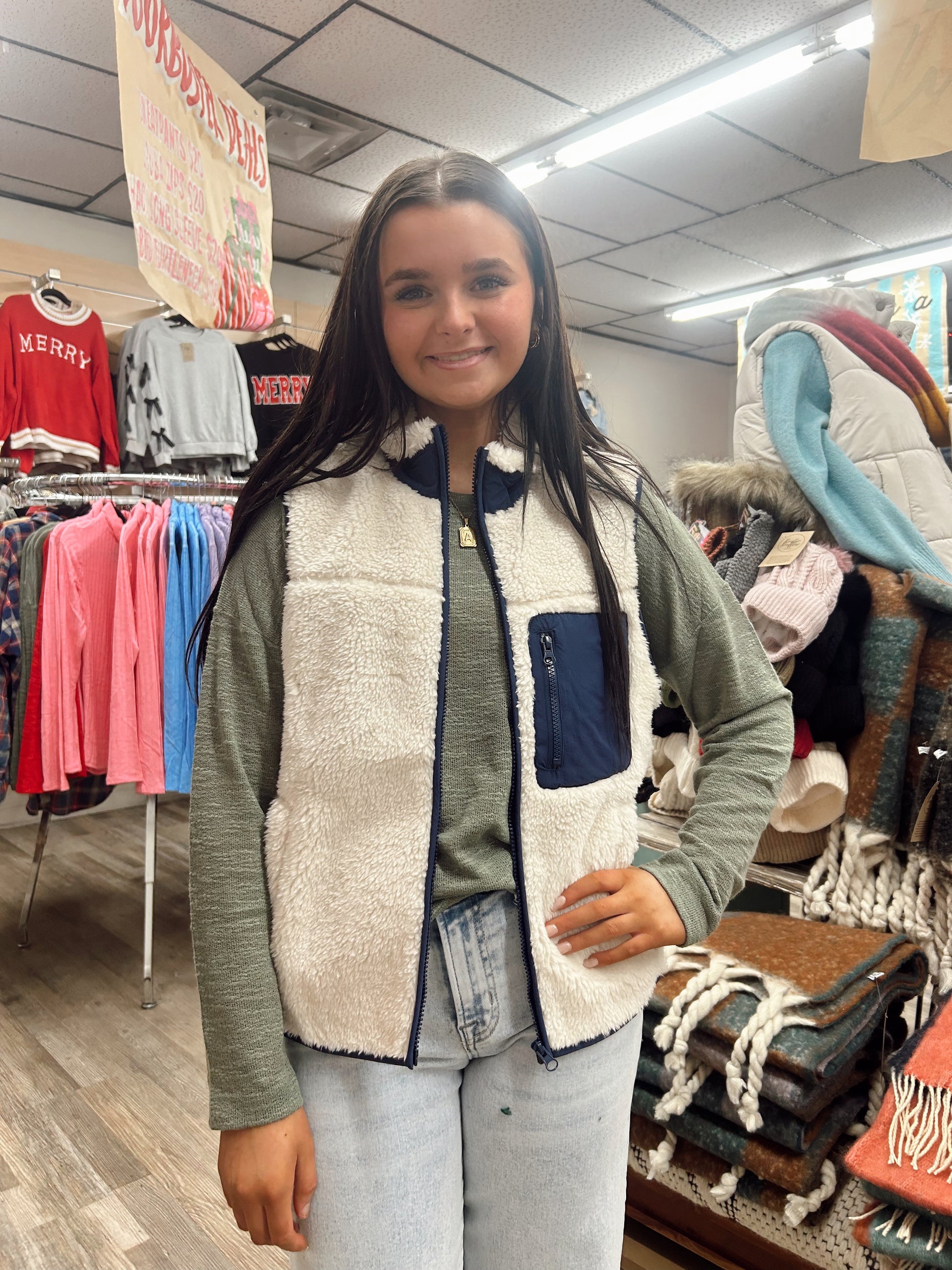 The Old Roads Sherpa Vest combines cozy comfort with effortless style. Crafted entirely from plush faux shearling, this relaxed-fit vest features a convenient front zipper, functional chest pocket, and stand-up collar for added warmth. The fully lined interior ensures lasting comfort through layering, while the loose silhouette makes it perfect for casual everyday wear. A versatile seasonal essential that transitions seamlessly from fall through winter.