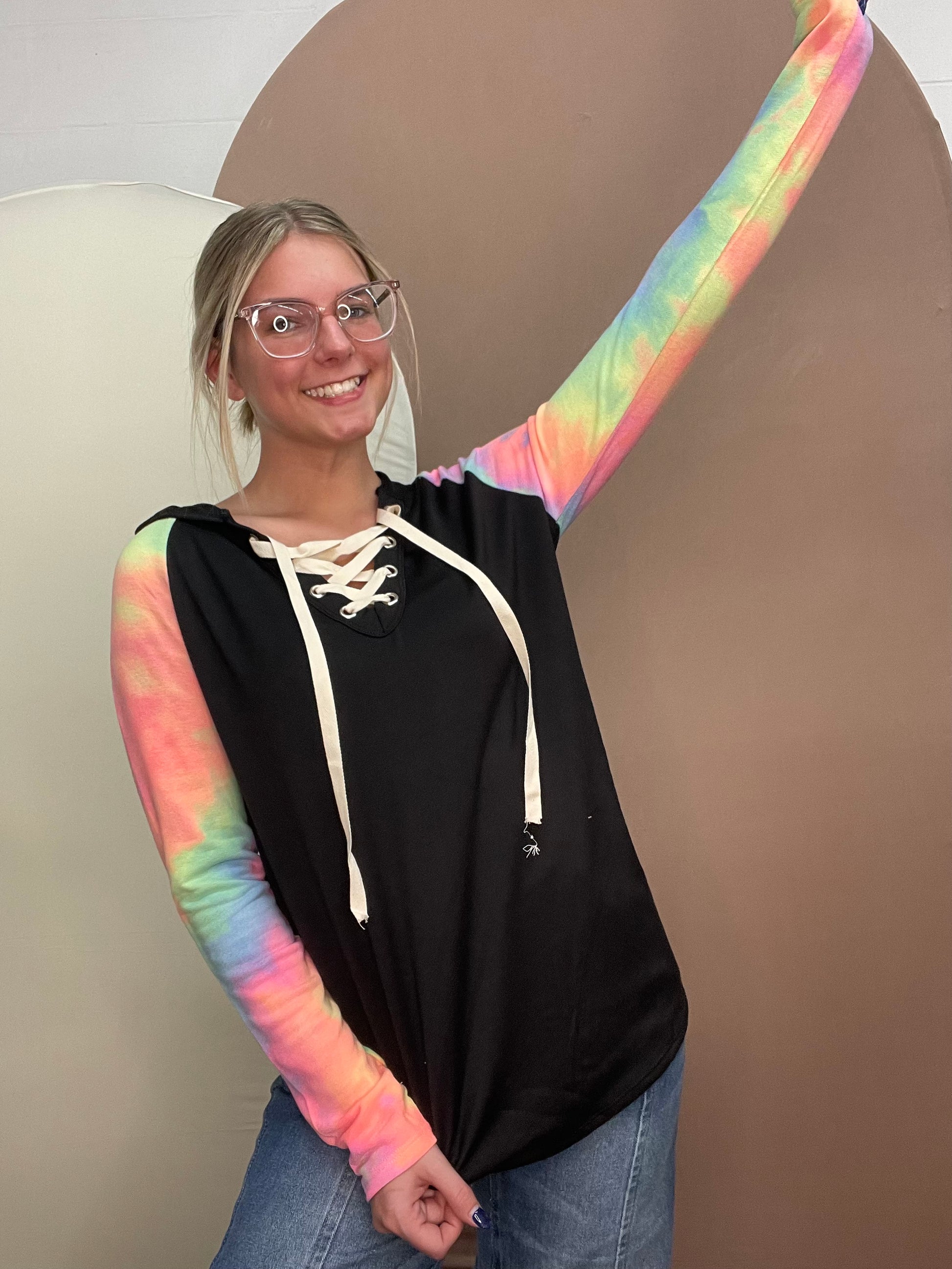 Add a pop of color to your wardrobe with our French Terry Lace Up Hoodie featuring bold tie dye sleeves. Stay cozy and stylish with this playful piece.