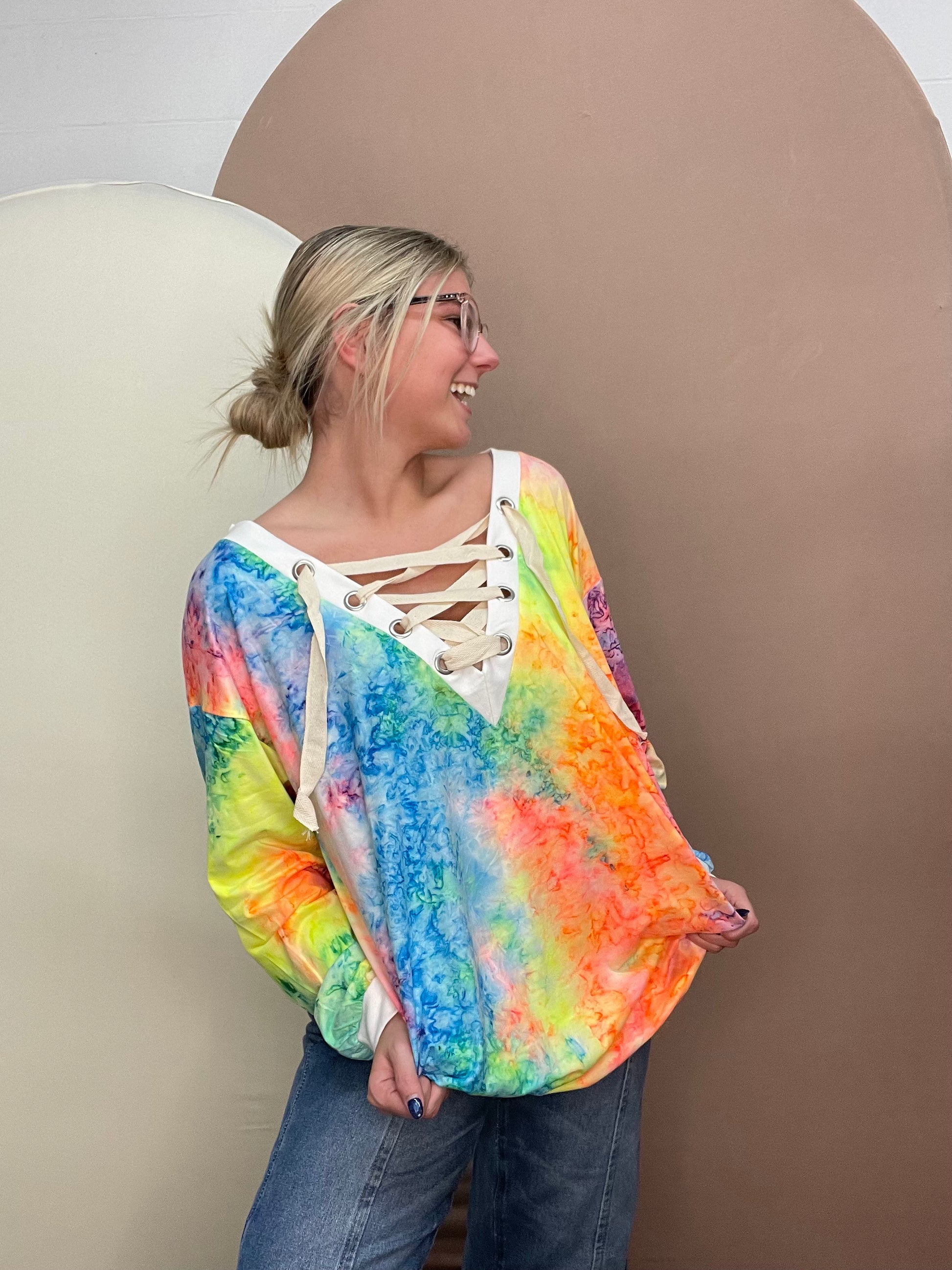 Unleash your inner rebel with our Real Good Tie Dye Long Sleeve Top! This top features a bold tie dye pattern, a deep V-neck, and a playful lace-up front. The contrast neck band and cuffs add a unique touch to this edgy and stylish piece. (Warning: may cause uncontrollable dancing!)
