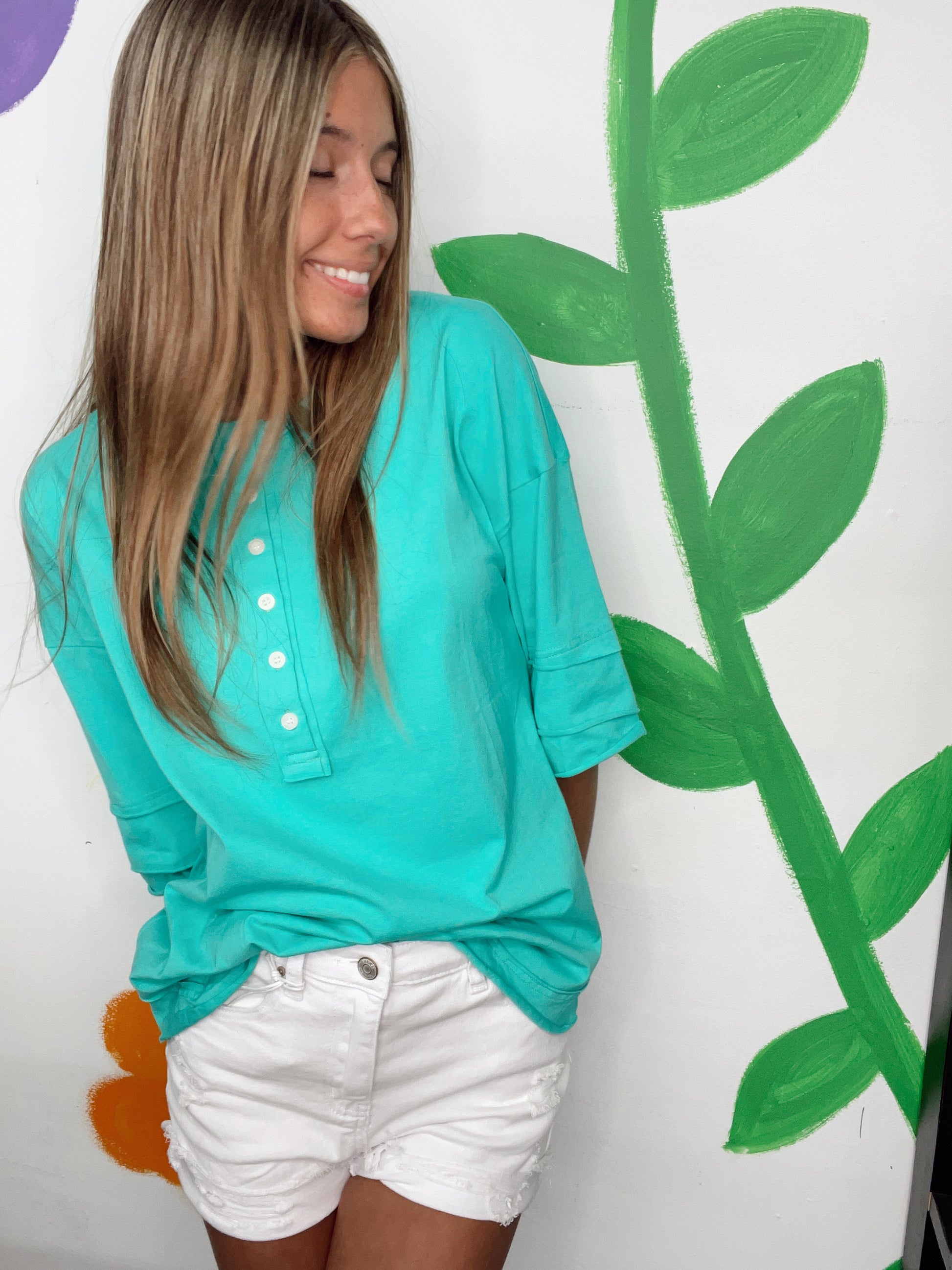 Experience a fresh look with our Same Ole Day Henley Top! This mint top features button detailing and slide slits, making it a stylish and functional addition to your wardrobe. Stand out from the crowd and embrace a playful and quirky style with this top!