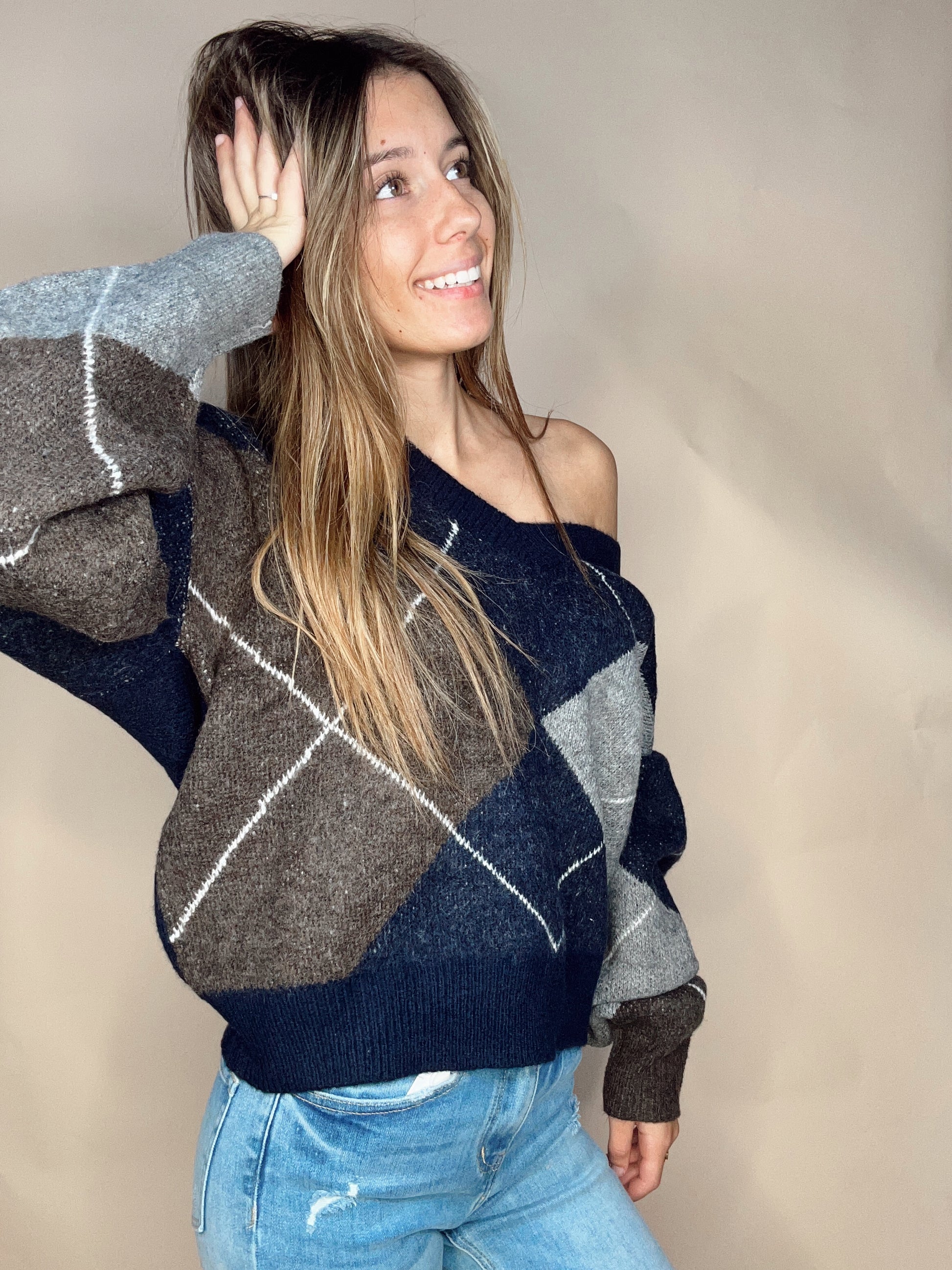 The Smart Girl Plaid Sweater combines timeless sophistication with modern comfort. This versatile pullover features a flattering V neckline and relaxed drop shoulders for an effortlessly chic silhouette. Long sleeves with ribbed trim provide structure and warmth, while the multicolor plaid pattern adds visual interest to any wardrobe. The knit construction offers breathability and flexibility, making it ideal for layering or wearing solo. Perfect for transitional seasons, this sweater elevates casual outfits with understated elegance and refined style.
