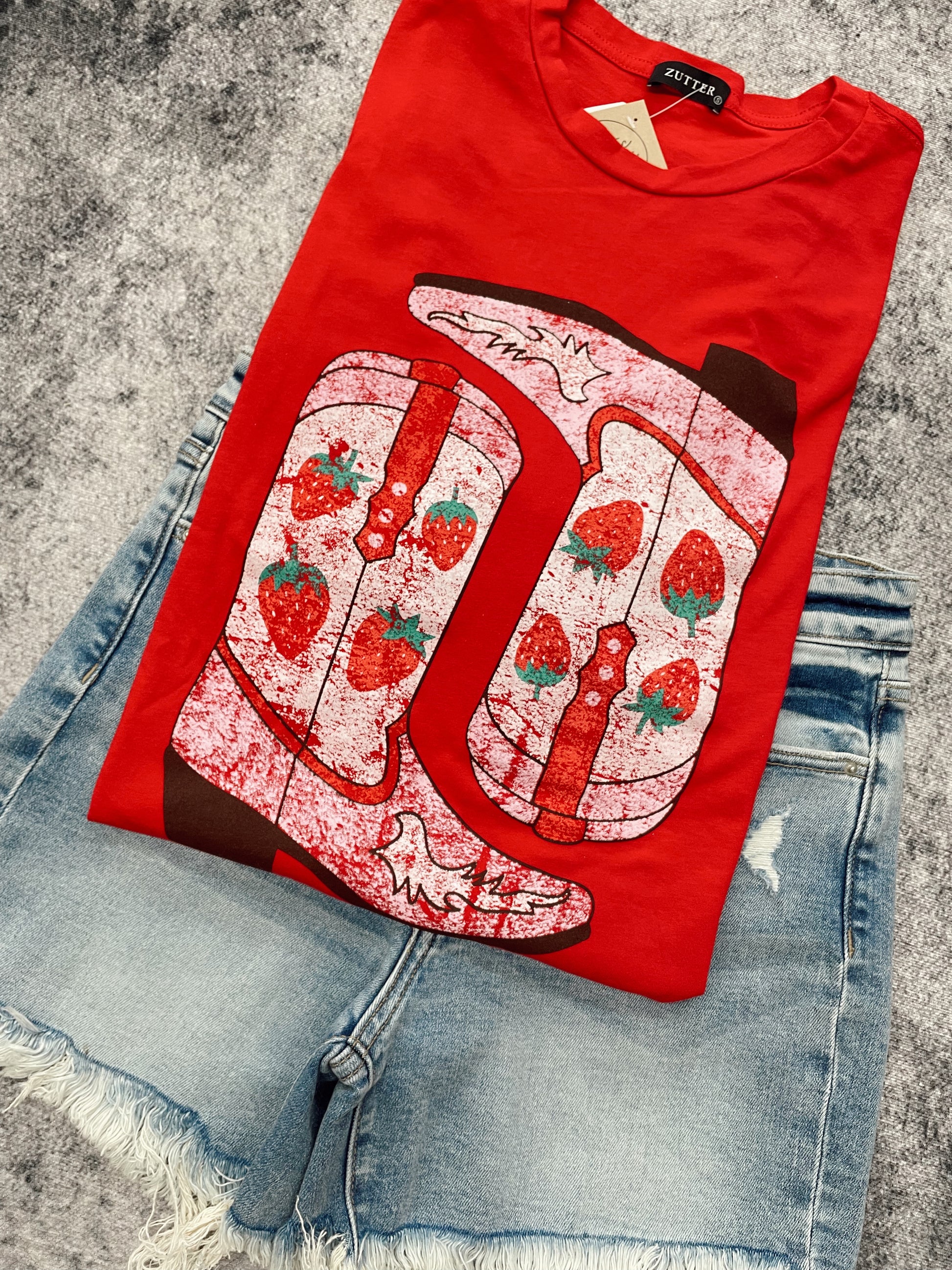 Introducing our Strawberry Cowboy Boots Graphic Tee! Featuring a bold red color and a playful design of strawberry cowboy boots, this tee will bring a touch of fun to your wardrobe. Made from high-quality fabric, this tee offers both comfort and style. Perfect for those who love to stand out in a unique and stylish way.
