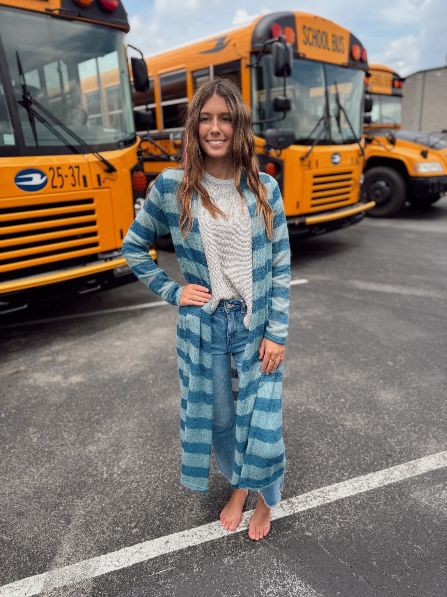Elevate your wardrobe with the Taught With Love Cardigan, featuring a sophisticated teal and blue striped pattern. This midi-length piece offers a perfect balance of style and comfort, ideal for layering in cooler weather. Crafted to provide a flattering fit, it seamlessly complements both casual and professional outfits, making it a versatile addition to your collection.