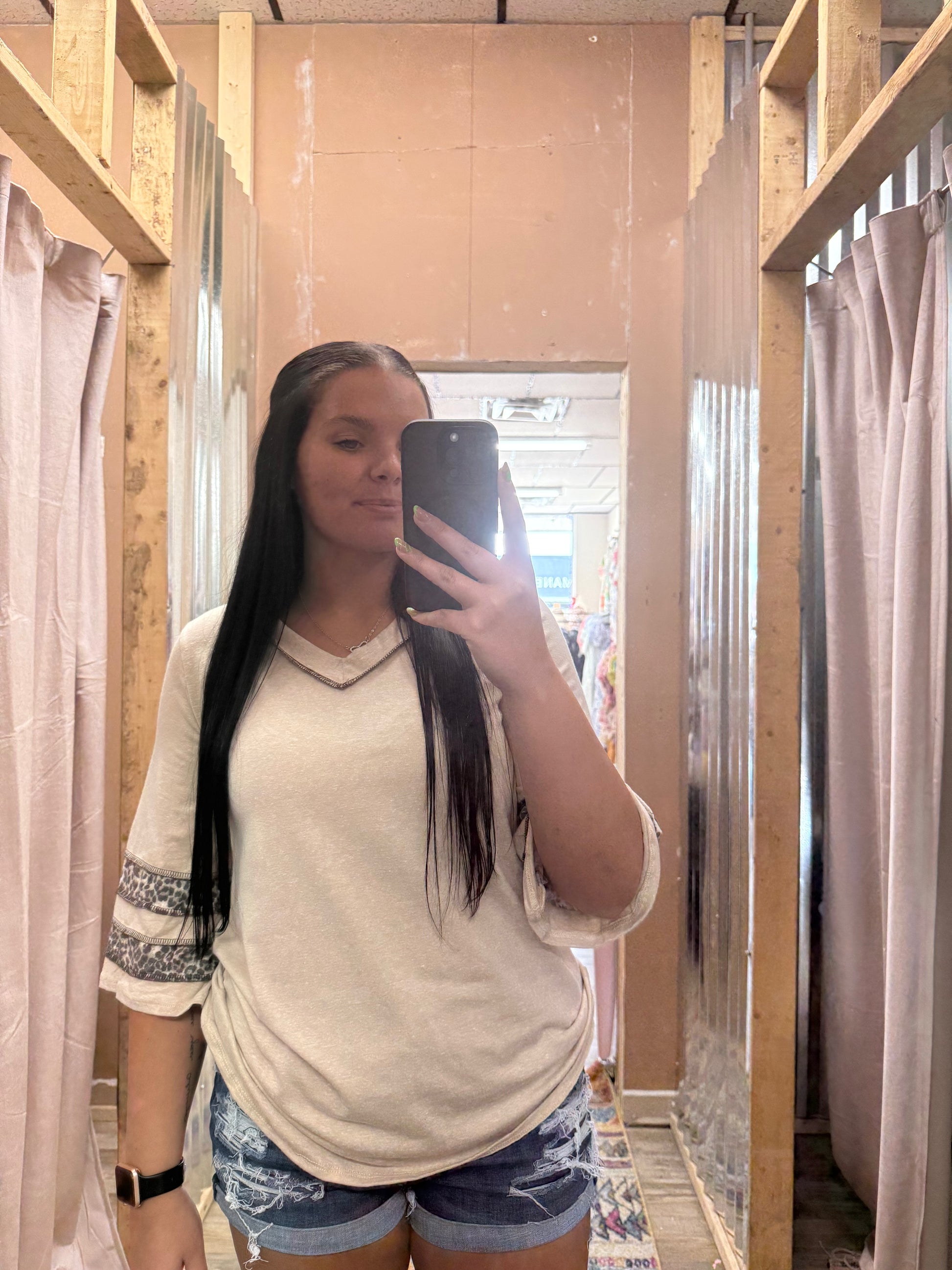 Get ready to walk in style with our Walk This Way Top! Made of a comfortable triblend knit, this top features a unique leopard band detail and reverse stitched three quarter sleeves. Perfect for a casual day out or a night on the town, this top will have you looking fierce and feeling comfortable. (Meow!)
