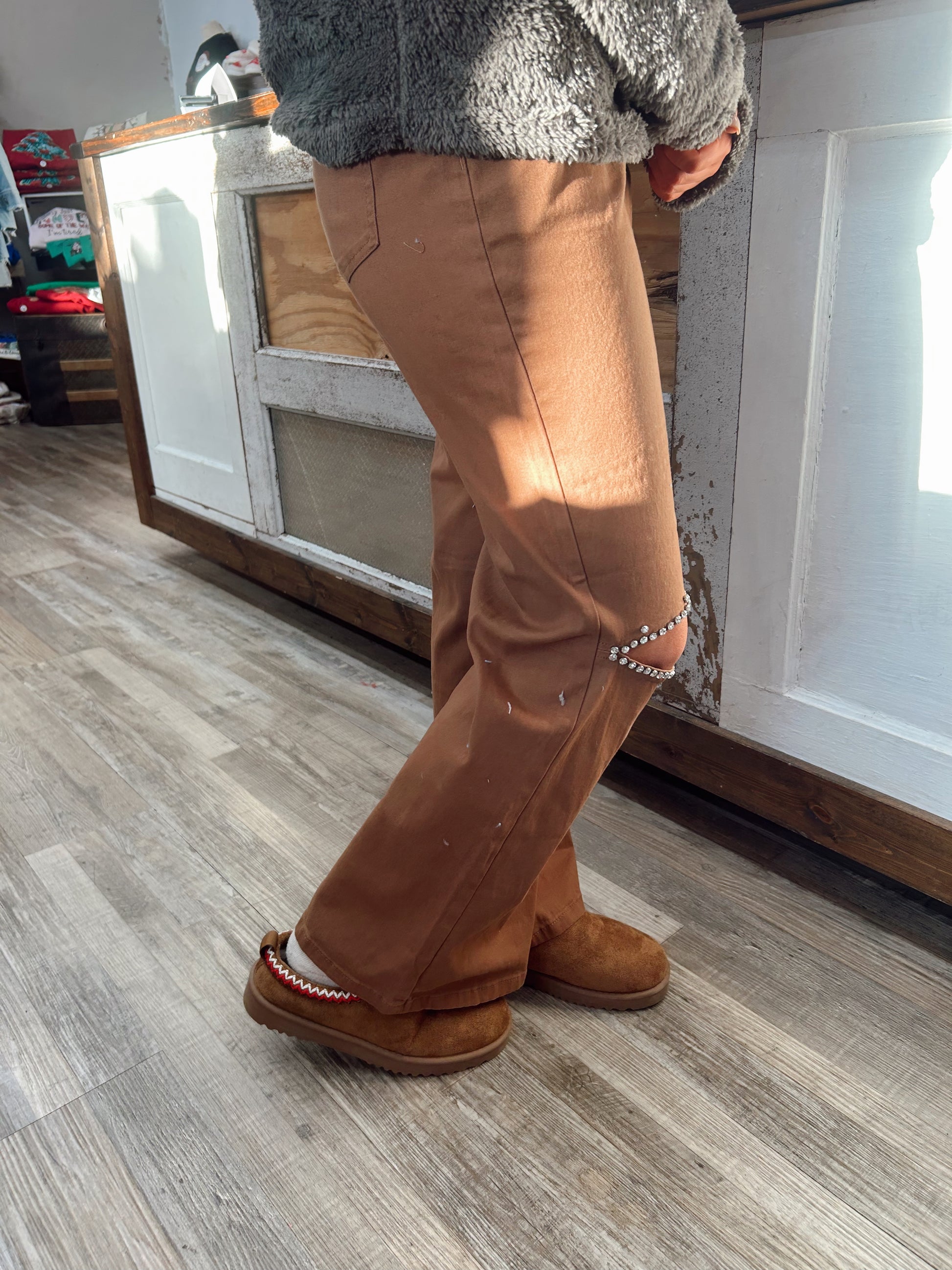 Make a statement with these Wild Light Rhinestone Jeans, expertly designed to balance edge and elegance. The high-waisted silhouette flatters your frame while the wide-leg cut offers unrestricted movement and contemporary style. Intricate rhinestone embellishments at the knee catch the light beautifully, transforming an everyday piece into a standout wardrobe essential. Crafted from quality knit denim, these jeans deliver the comfort you need without compromising on impact. Perfect for those who refuse to choose between fashion-forward design and wearability.