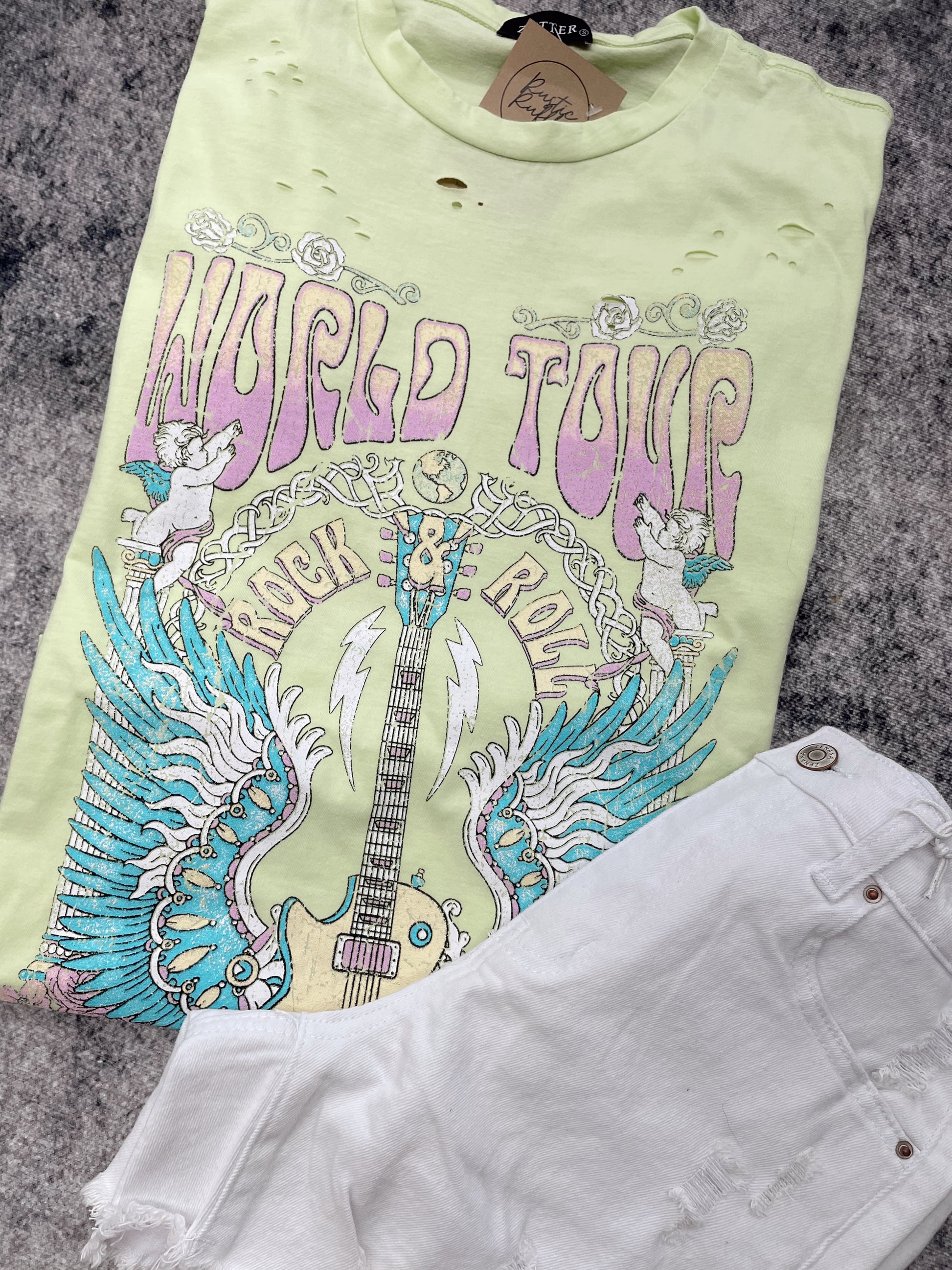 Get ready to rock and roll with our oversized World Tour graphic tee. With a funky tie dye design, this tshirt will make you stand out in any crowd. Perfect for any music lover, this black tee is a must-have addition to your wardrobe.